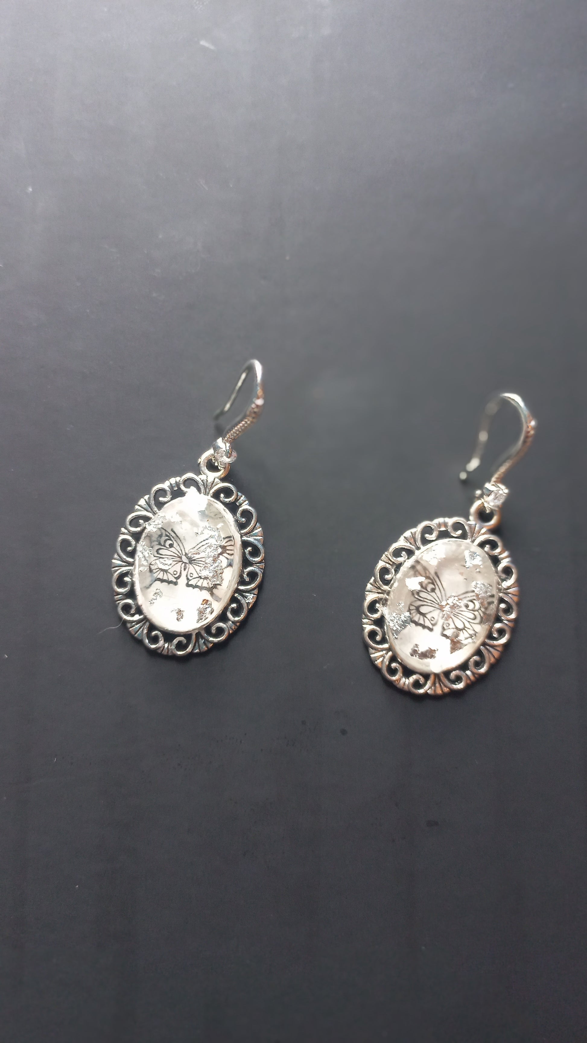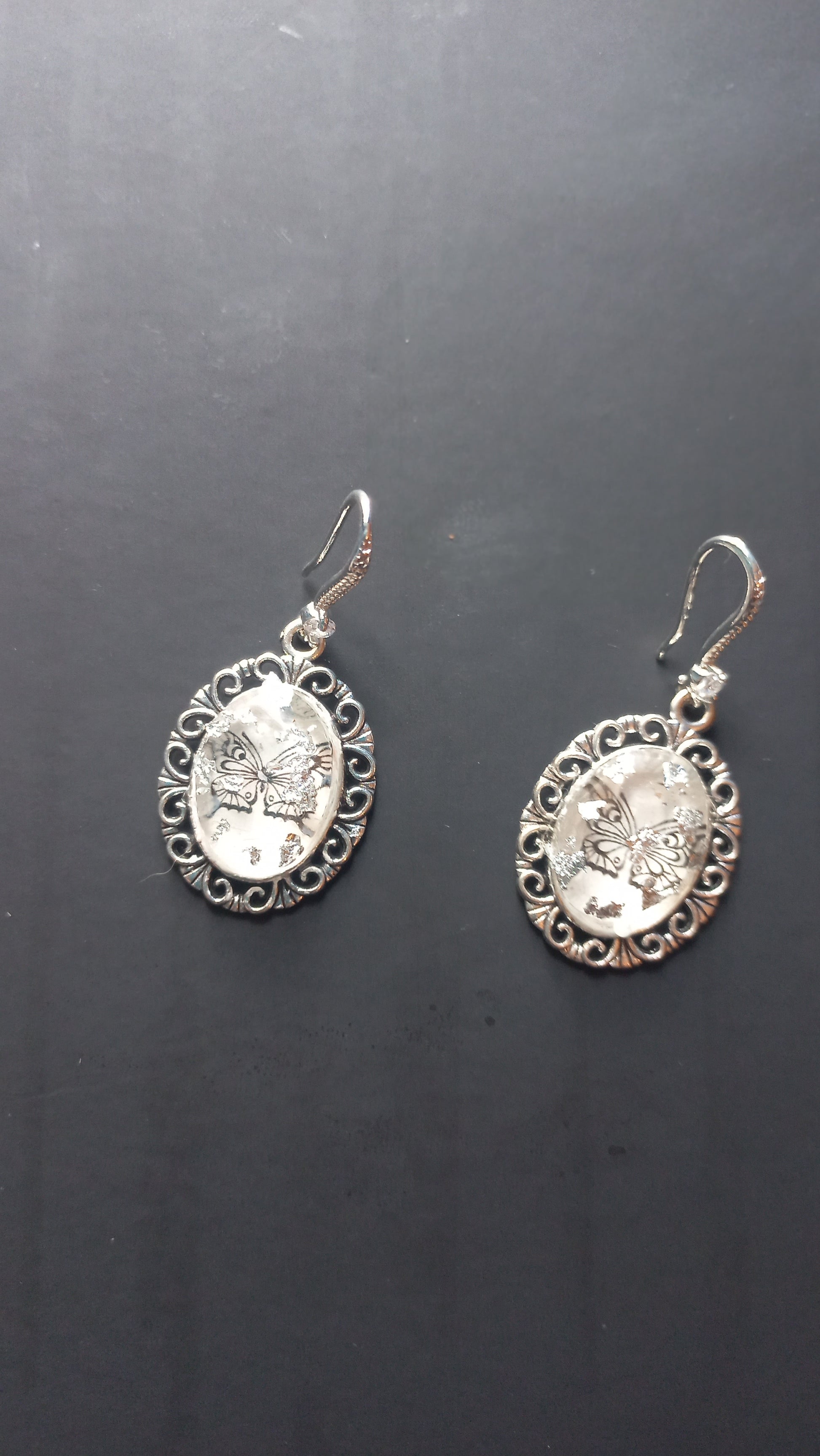Vintage antique painted black butterfly in resin with silver foil inlay